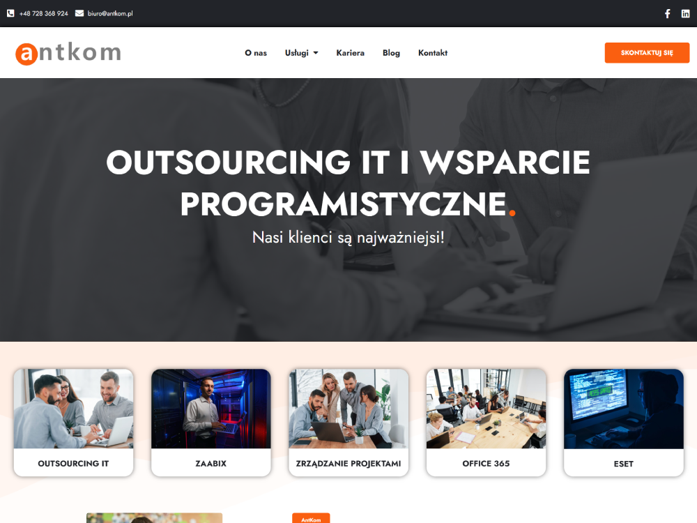 Witryna zawiera dedykowane podstrony dla każdej z kluczowych usług, prezentując szczegółową ofertę. Wizualizacje oraz loga partnerów technologicznych wzmacniają wizerunek AntKom jako nowoczesnego i zaufanego dostawcy rozwiązań.